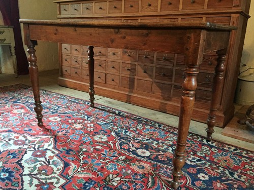 Pieds tournés en noyer (?), plateau et ceinture en bois blanc teinté, patine ancienne.