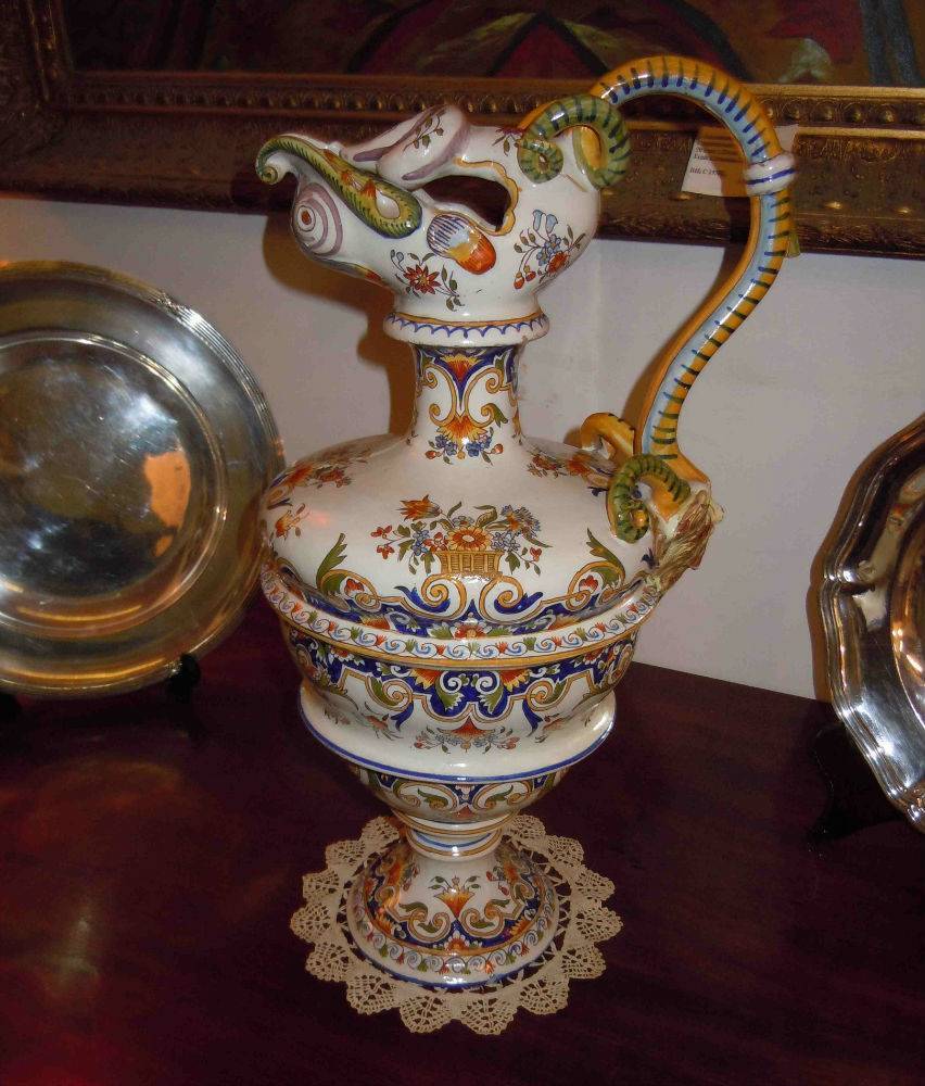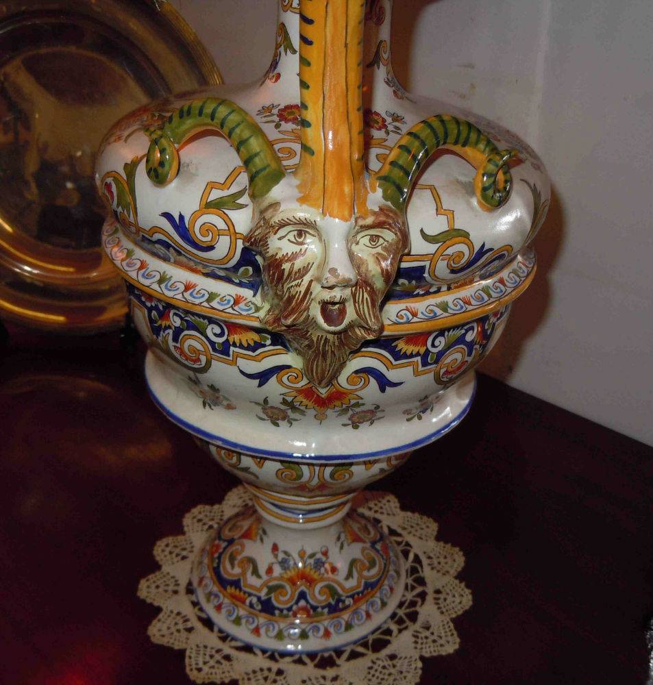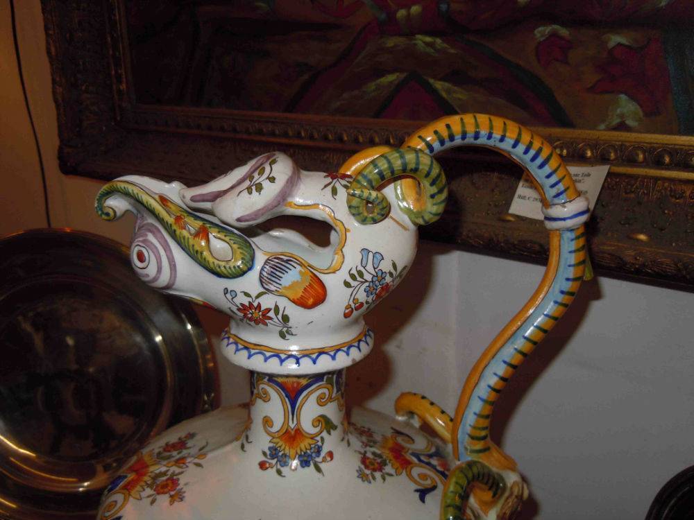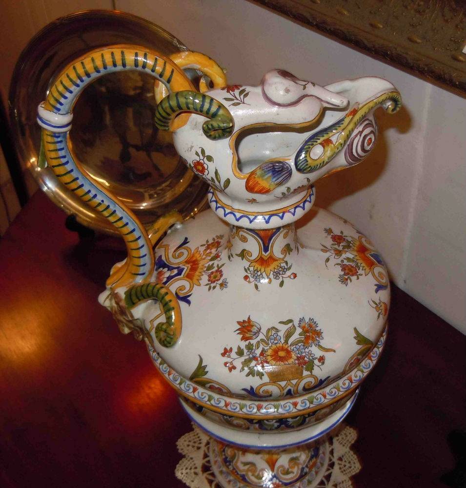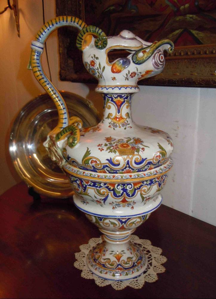 Ancienne grande aiguière verseuses en faïence polychrome de Desvres à décor Rouen. Aiguière en faïence à décor polychrome dans le goût de Rouen. Marquée au revers. « Rouen 1290 ». Cette aiguière verseuse porte un riche décor peint et des mascarons en relief. L’anse sculptée a la forme d’une sorte de dragon à tête de bélier. La richesse tient autant à l’ornementation peinte qu’à l’exubérance des motifs en relief On se servait habituellement de l’aiguière pour se laver les mains. Le décor peint traité en polychromie de grand feu couvre la surface de la pièce et cache la blancheur de la faïence. Ornementation florale, décor de fleurs de lys, motifs géométriques en forme de frises, volutes, rinceaux, paniers fleuris, animaux stylisés ou influencés de la mythologie. Le décor de cette aiguière fait penser aux oeuvres produites à Urbino en Italie. L’ensemble fait penser aux grandes majoliques italiennes. Le bec verseur est très impressionnant par son ornementation et ses formes mouvementées et galbées. L’aiguière repose sur une forme « piédouche ». Très bel objet de collection qui a appartenu à l’ancien Chef du Bateau Le France.