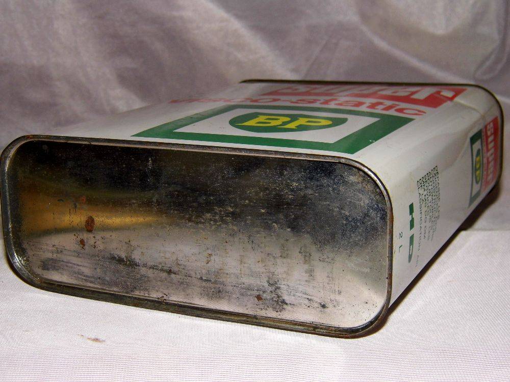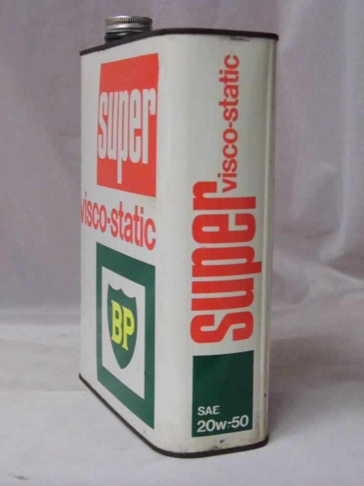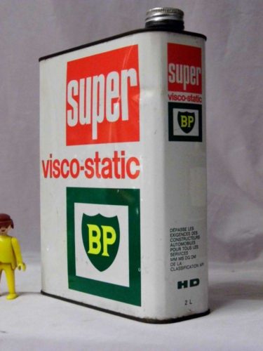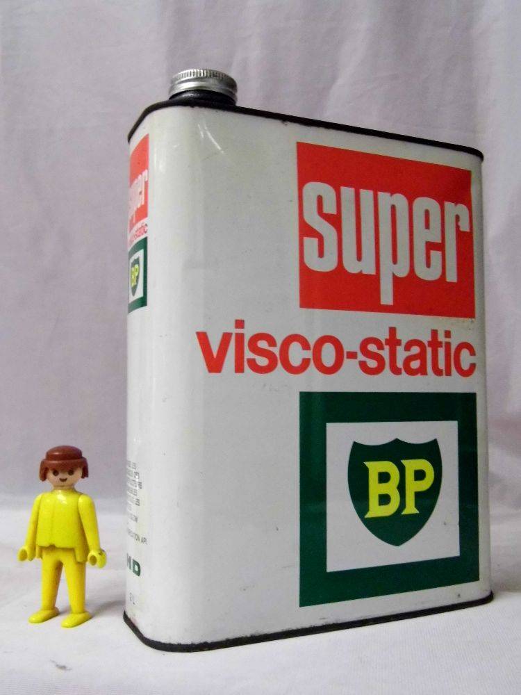 Ancien bidon d’huile en tôle BP SUPER VISCO-STATIC – Présence de marquage sur toute les faces – Présence du bouchon d’origine – Le bidon est vide – Contenant de 2 litres – Non corrodé – Couleurs fraiches