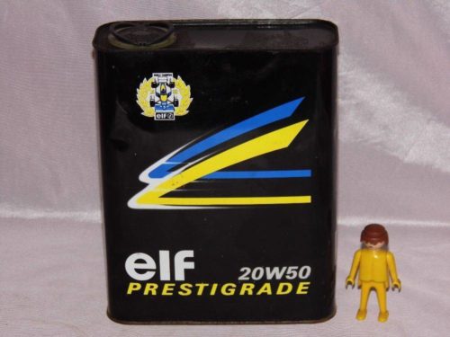 Ancien bidon d’huile en tôle ELF RENAULT 1992 – Made in France – Marquage – Présence du bouchon – Le bidon est vide – Contenant de 2 litres –