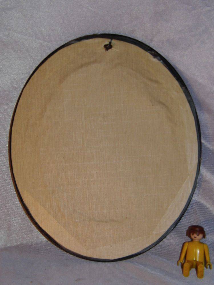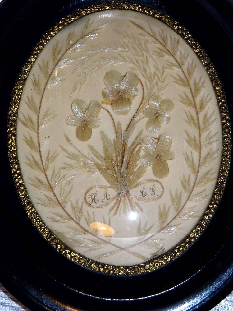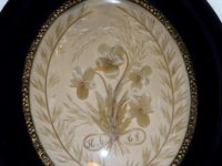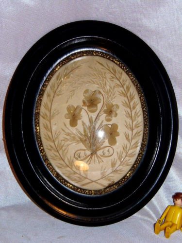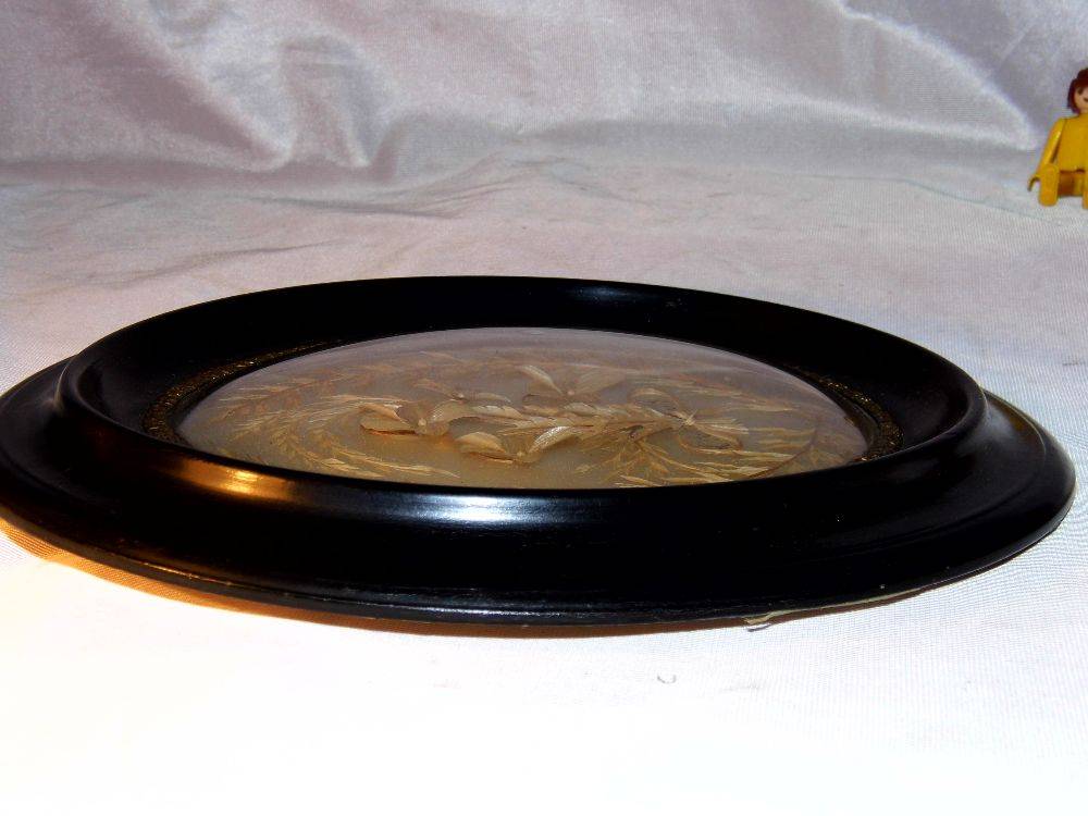 Ancien cadre ovale vitre bombée médaillon NAPOLÉON III reliquaire du XIX eme siècle – Décor floral séché avec monogramme – Laurier – Entourage bois noirci et collier de métal en relief doré – Petite griffe très discrète au centre du verre se voit très peu ! –