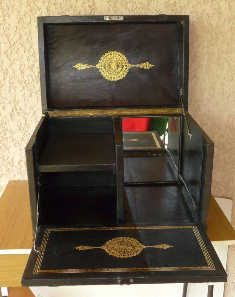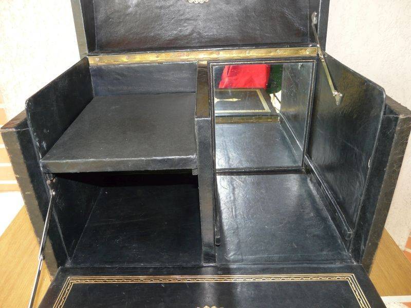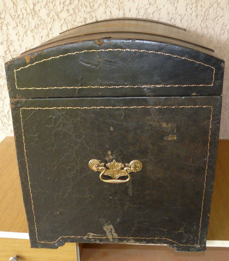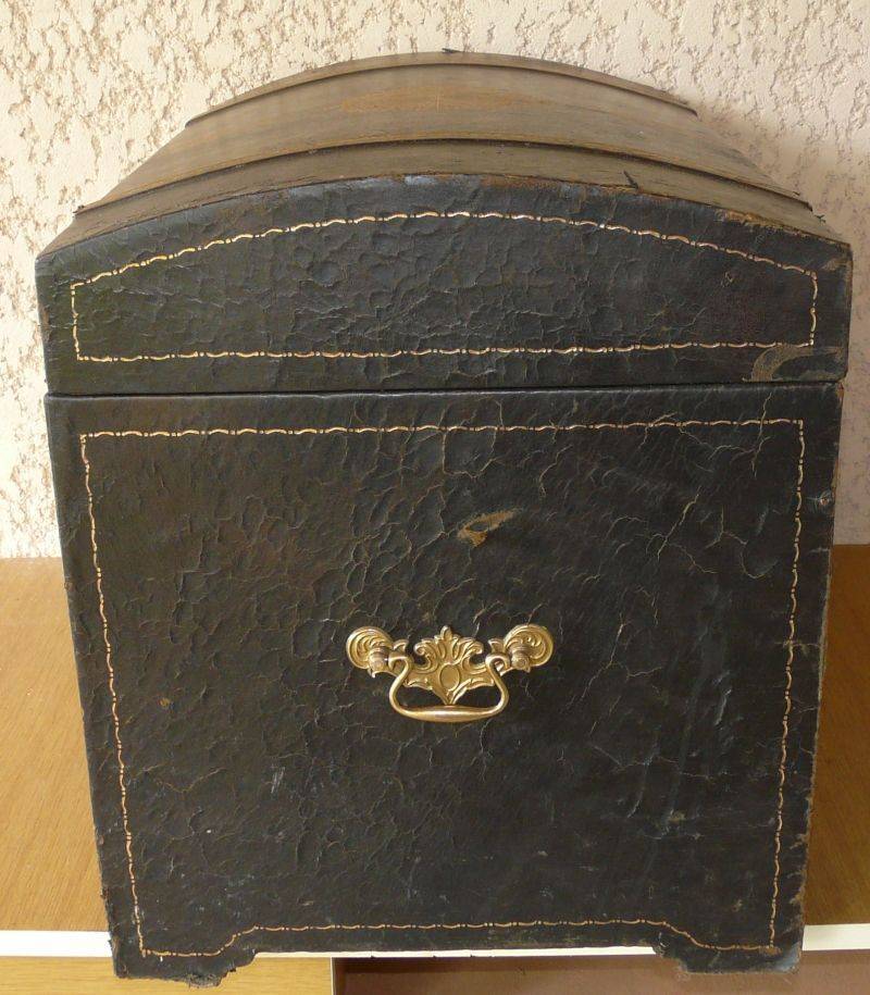en bois recouverte de cuir (le cuir est abîmé à plusieurs endroits)