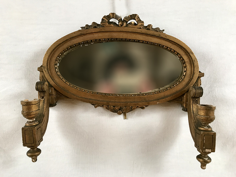 Applique miroir en bois doré portant deux bougeoirs de style Louis XVI