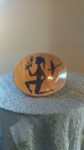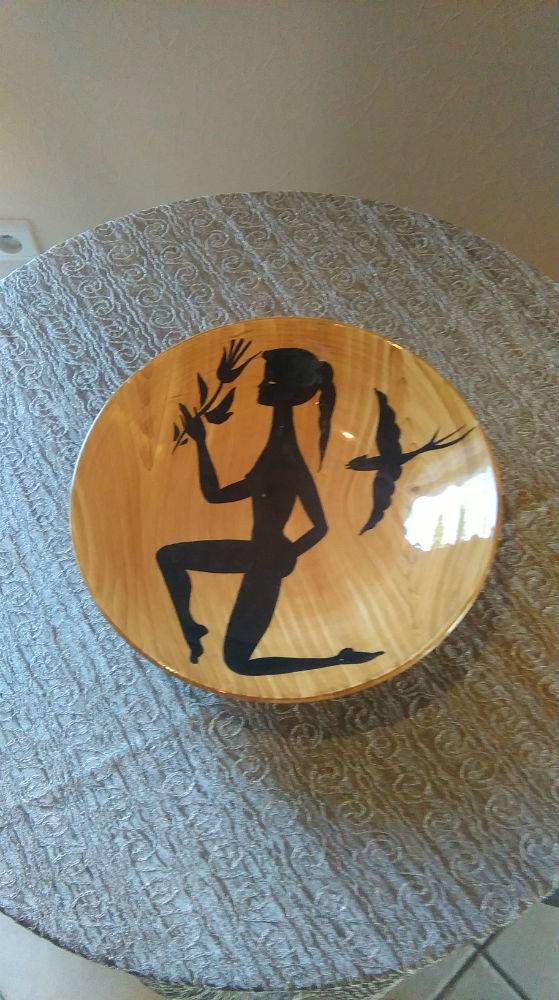 En céramique de Vallauris, imitation faux bois, à décor « la jeune fille et l’oiseau » en émail noir