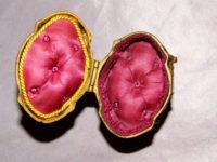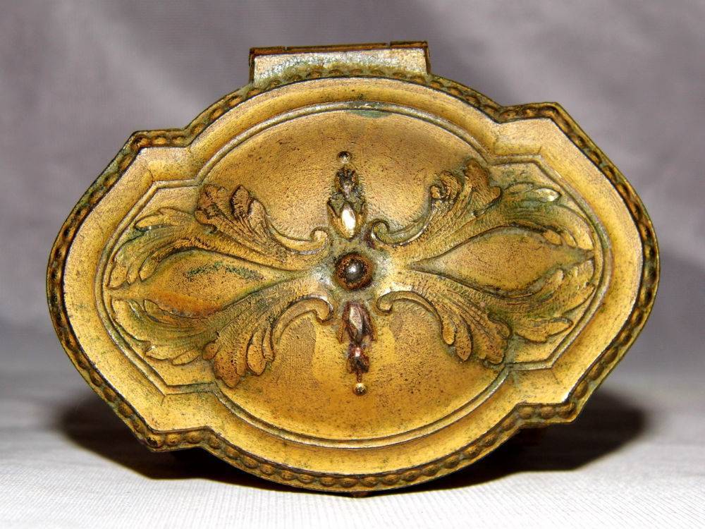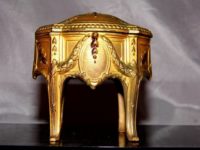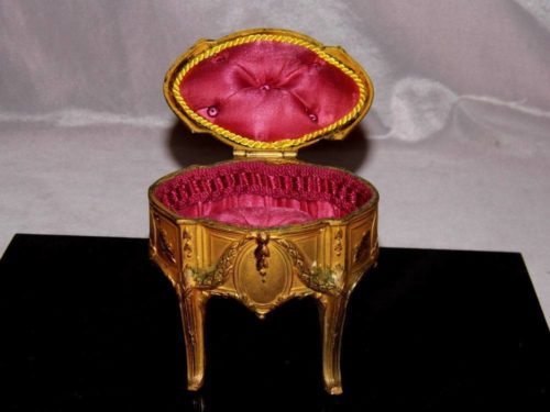Ancienne boite à bijoux en régule doré XIX eme – Capitonné coussin et tissu soie rouge à l’intérieur – Déposé 481 – Bonne fermeture du couvercle – Charnière en très bon état