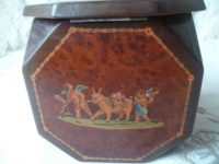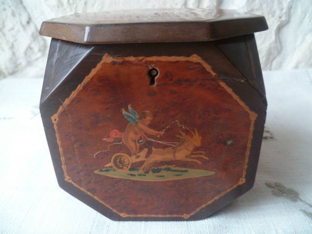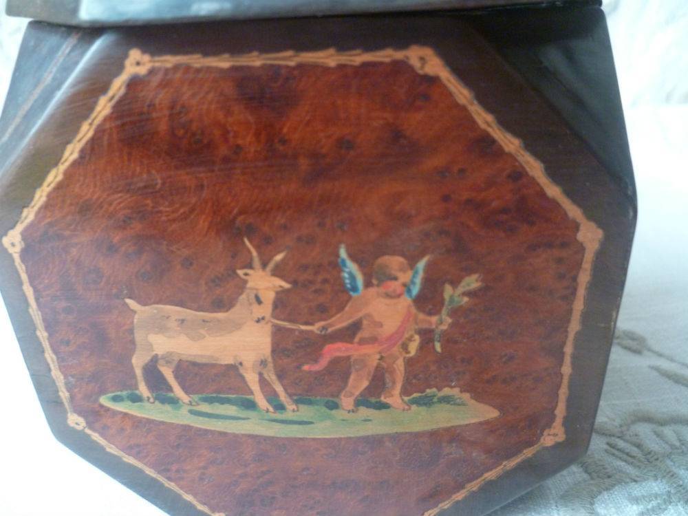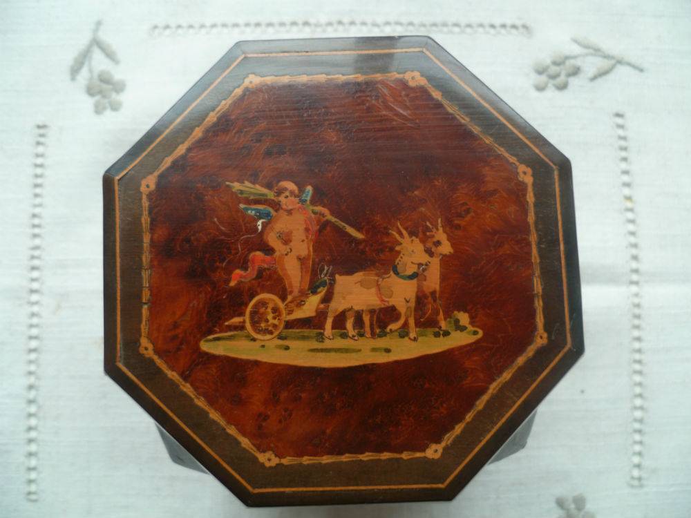 Sur chaque côté, marqueterie différente, entouré d’un filet clair.