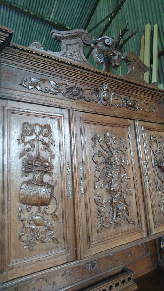 Très beau buffet deux corps style Louis XIII sur le thème de la chasse.