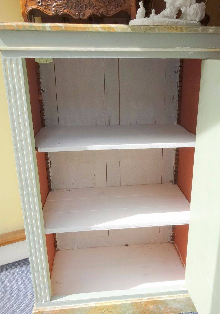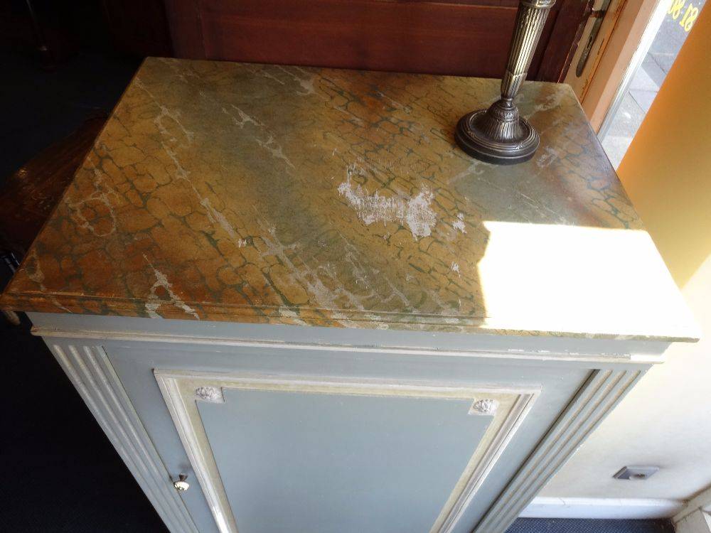 Meuble ouvrant à une large porte en bois peint , notamment en faux marbre sur le dessus et la plinthe ( petits manques de peinture sur le dessus).