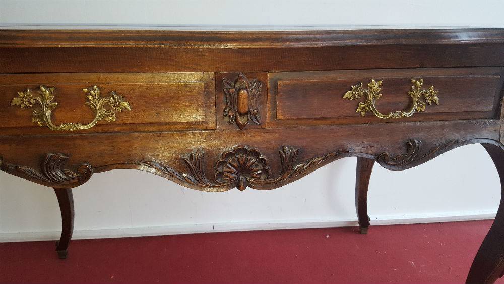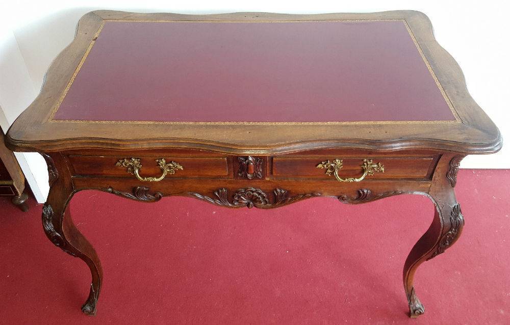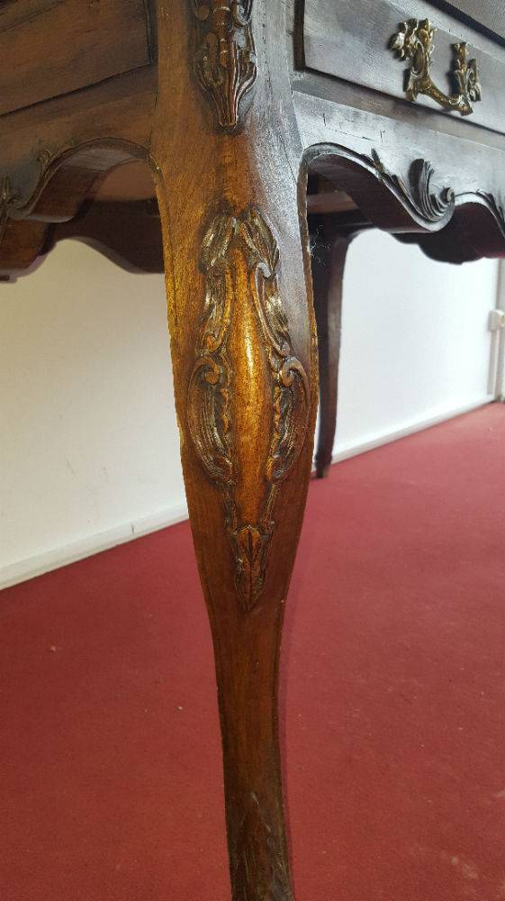 bureau Louis XV Baroque en noyer avec un abondant décors de sculptures.