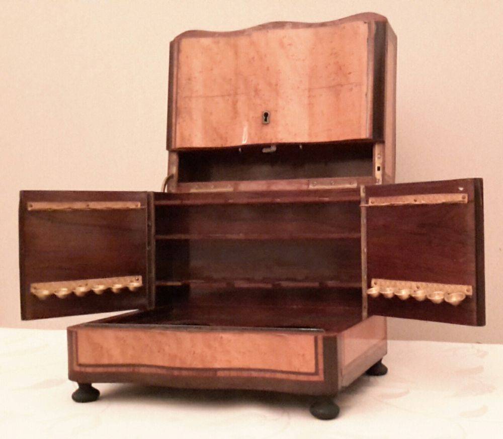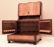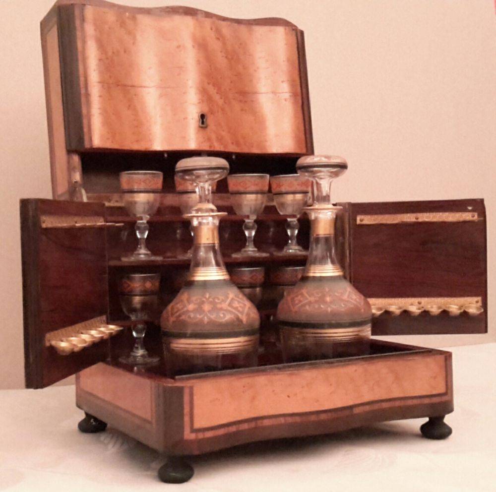 magnifique petite cave à liqueur, en loupe de citronnier. Comportant deux carafes et 8 verres. tous identiques. l’ensemble est complet et en très bon état. elle dispose aussi de compartiments pour les cigares.