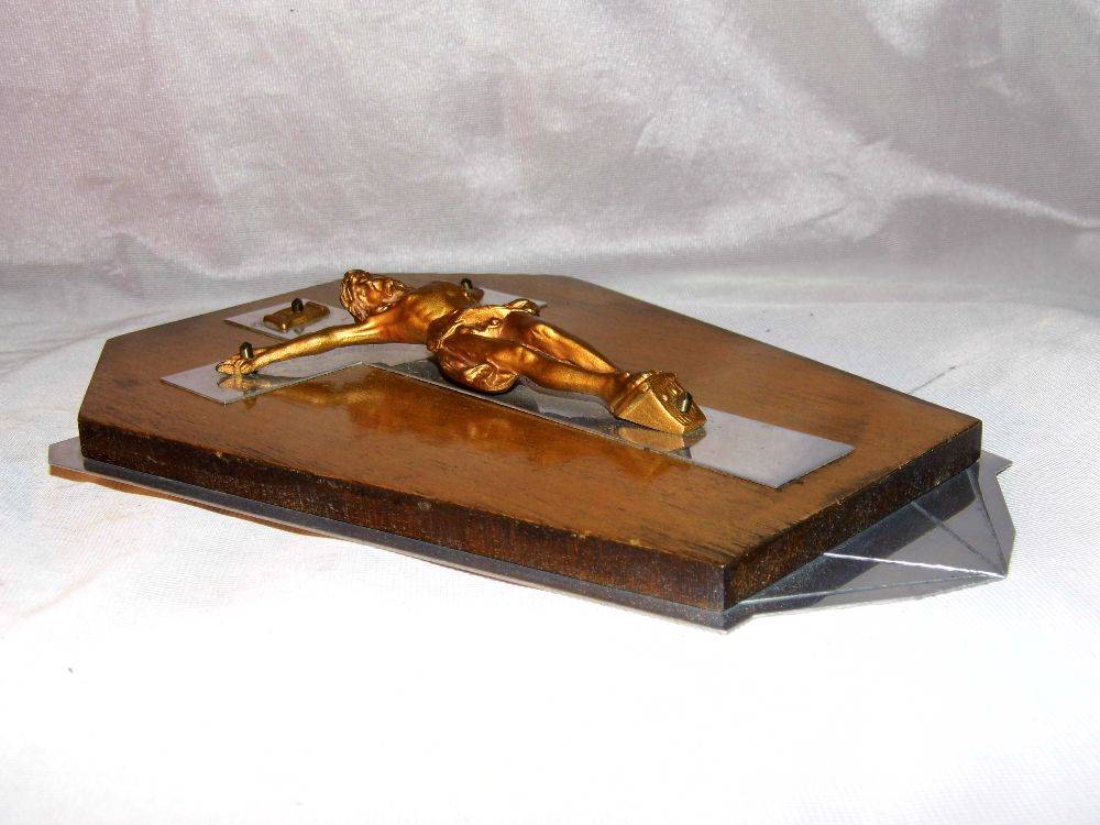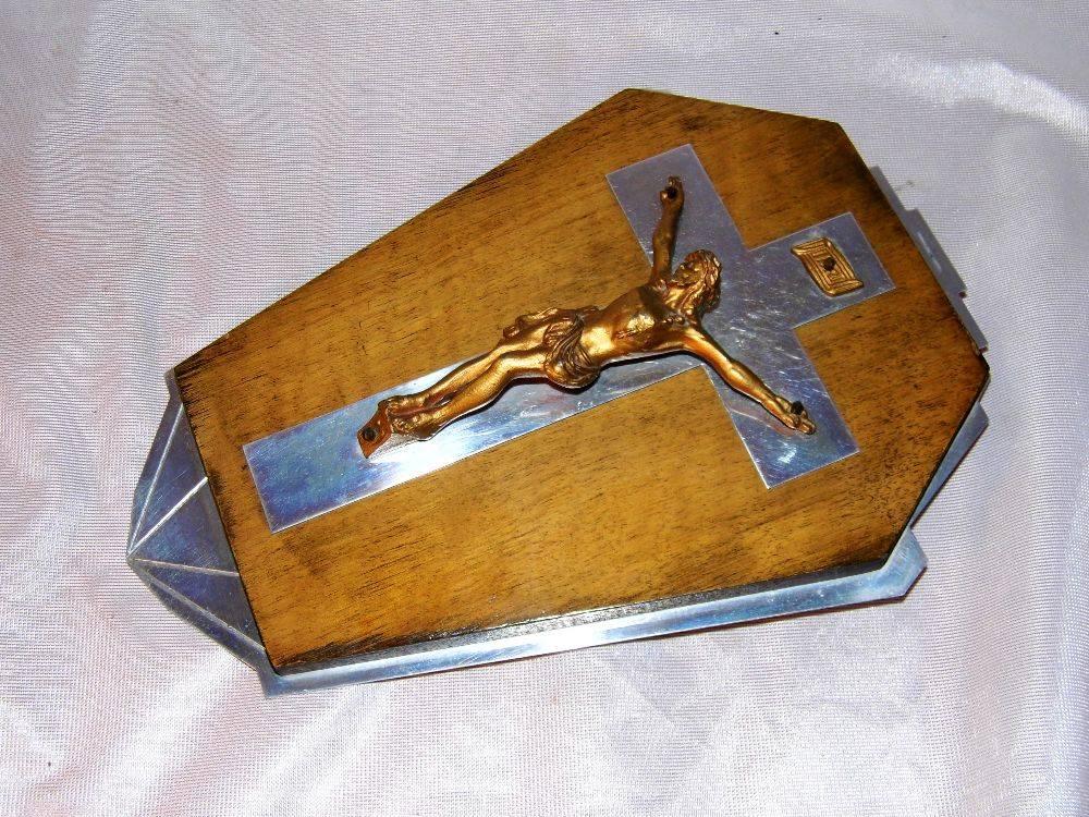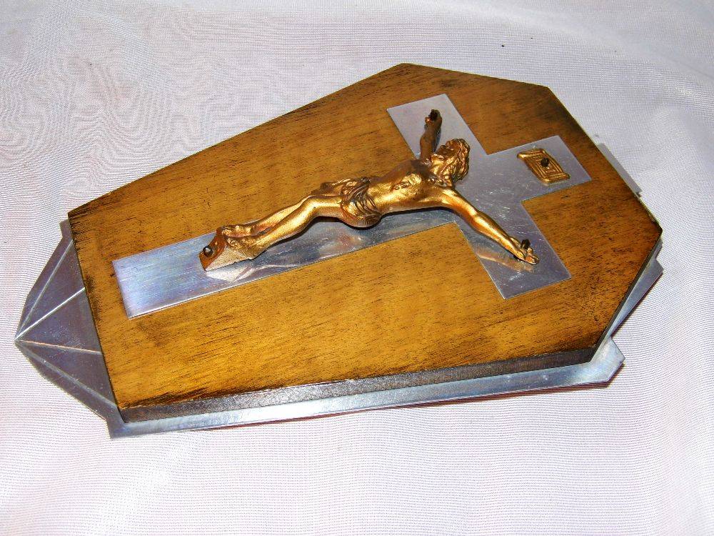 Crucifix croix art deco religieux en métal et bois – Présence de l’accroche murale –
