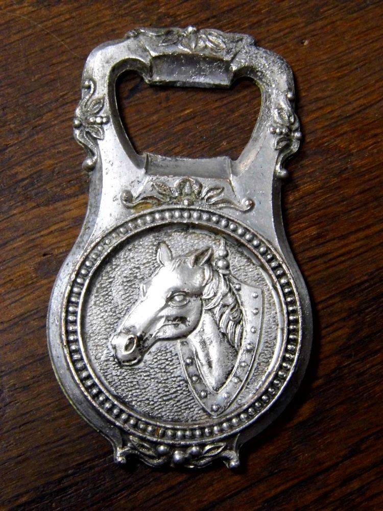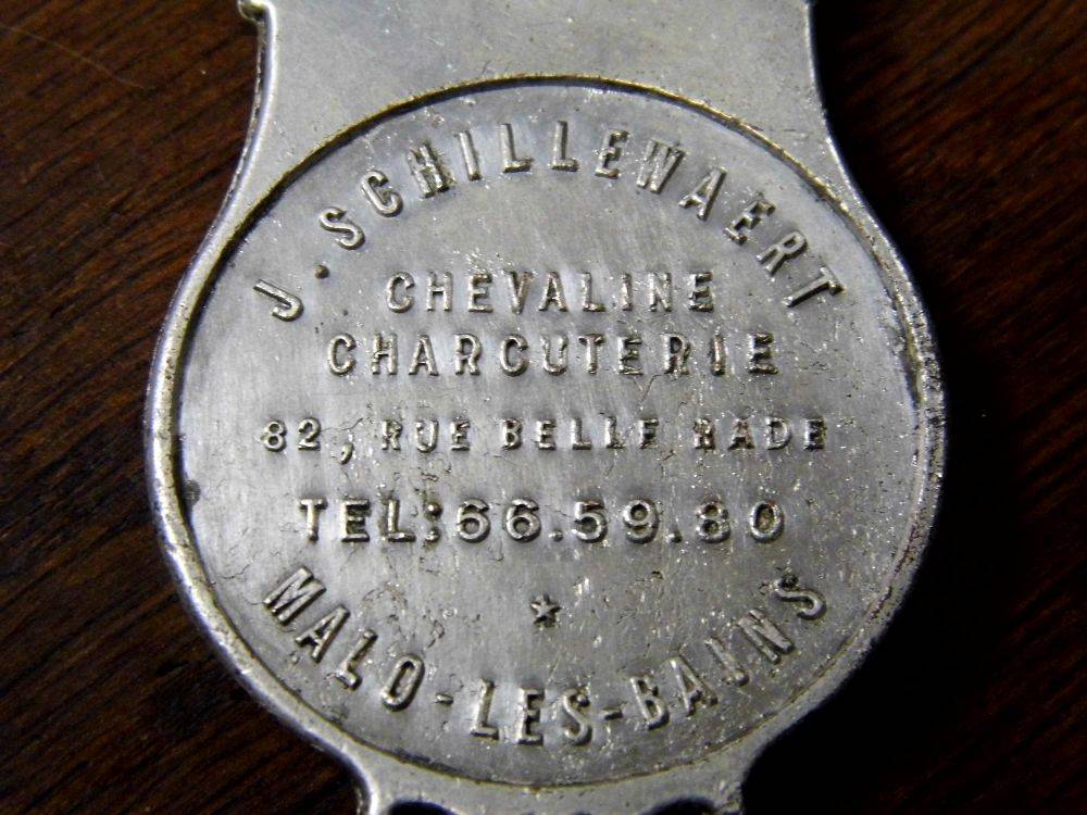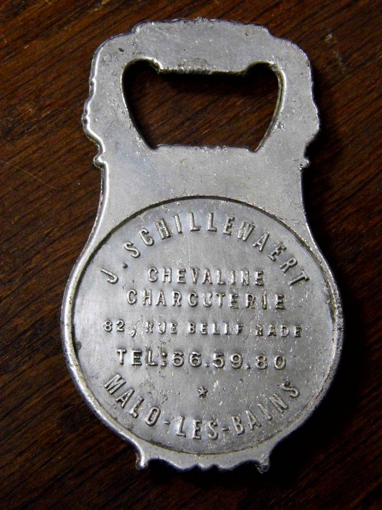 Ancien décapsuleur publicitaire BOUCHERIE CHEVALINE du boucher J. SCHILLEWAERT à Malo les bains, rue Belle rade – Matière : Métal – Décoration en relief d’une tête de cheval –