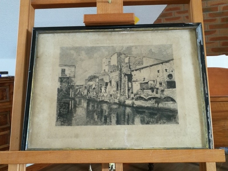 Eau forte ancienne représentant le Sarno à Scafati (Italie)