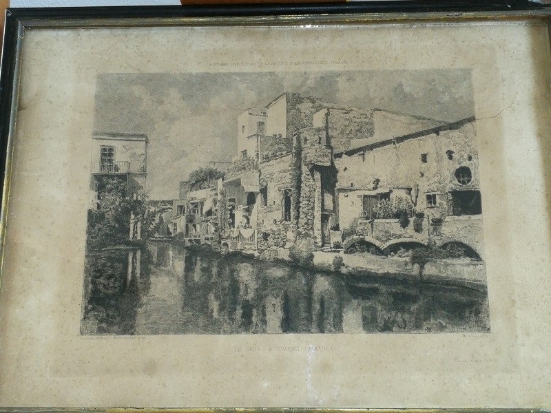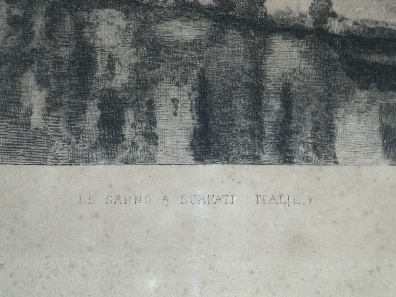 Eau forte ancienne représentant Le sarno à scafati (Italie)