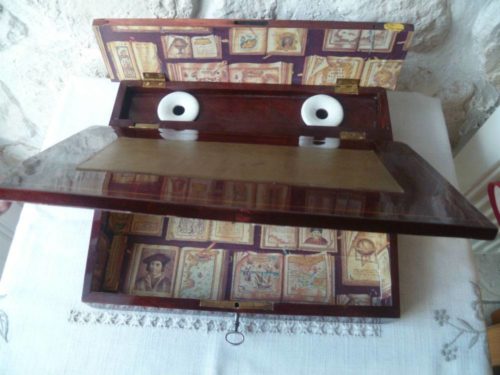 Sur le dessus de l’écritoire , il y a un cuir couleur vert.