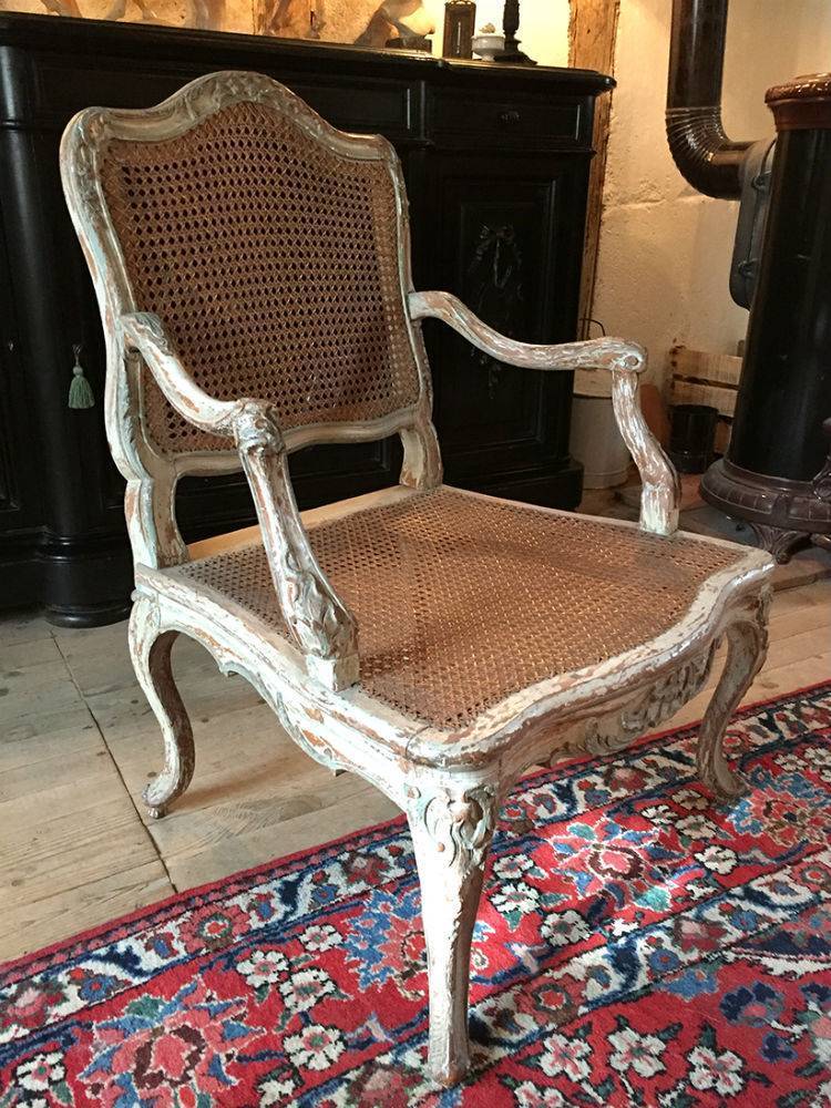Fauteuil de style Louis XV laqué gris et fond de canne. XIXe