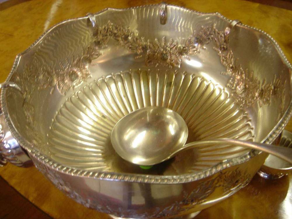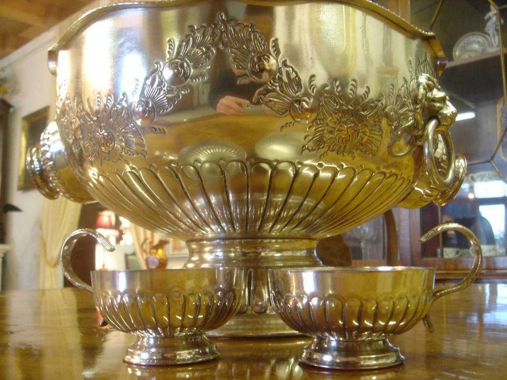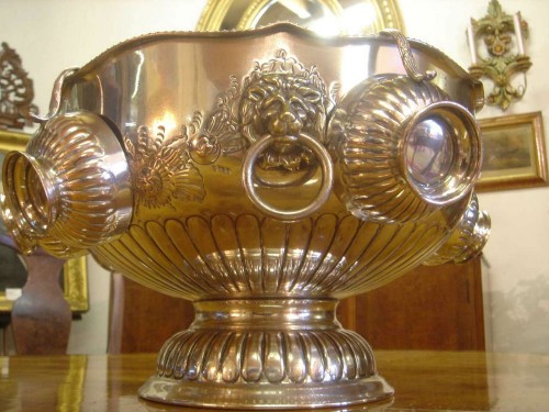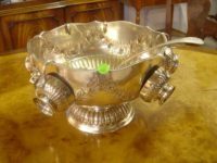 Superbe seau, bol ou saladier à cocktail en métal argenté, d’époque XIXème Siècle, comprenant les coupelles mêmes à déguster punch ou cocktails ainsi que la louche. L’ensemble est finement ciselé de guirlandes de fleurs, volutes, soleils et têtes de lions dans les anses. Le socle ou base est à motifs de godrons. L’intérieur est également finement ciselé.