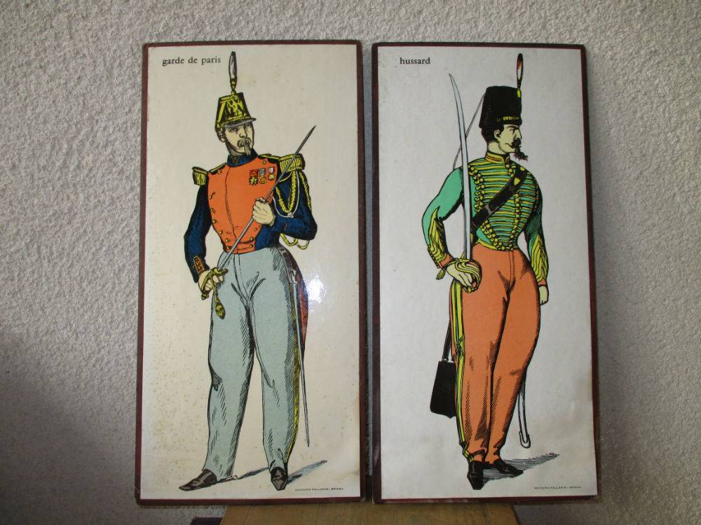 2 grande images d’Epinal figurant des militaires. Un garde de Paris et un Hussard.