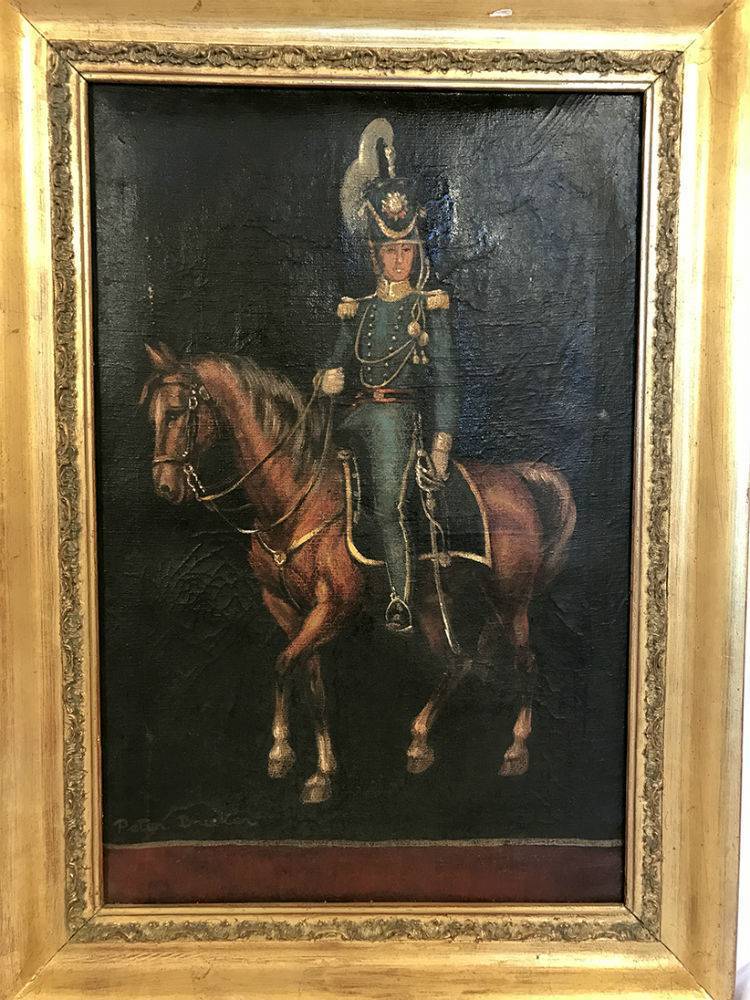 Huile sur toile « Militaire à cheval » Peter Bauker (?)