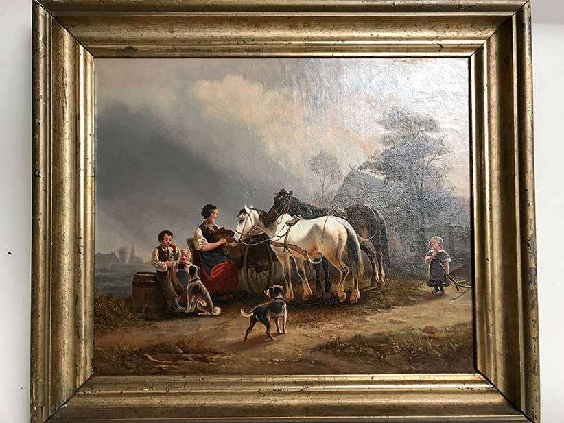 Huile sur toile signée, encadrée « scène animée de cour de ferme »
