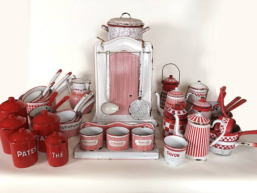 Histoire de l'objetBelle collection d'objets de cuisine en tôle émaillée estampillée, complétée au fil des années en chinant aux quatre coins de la France… |