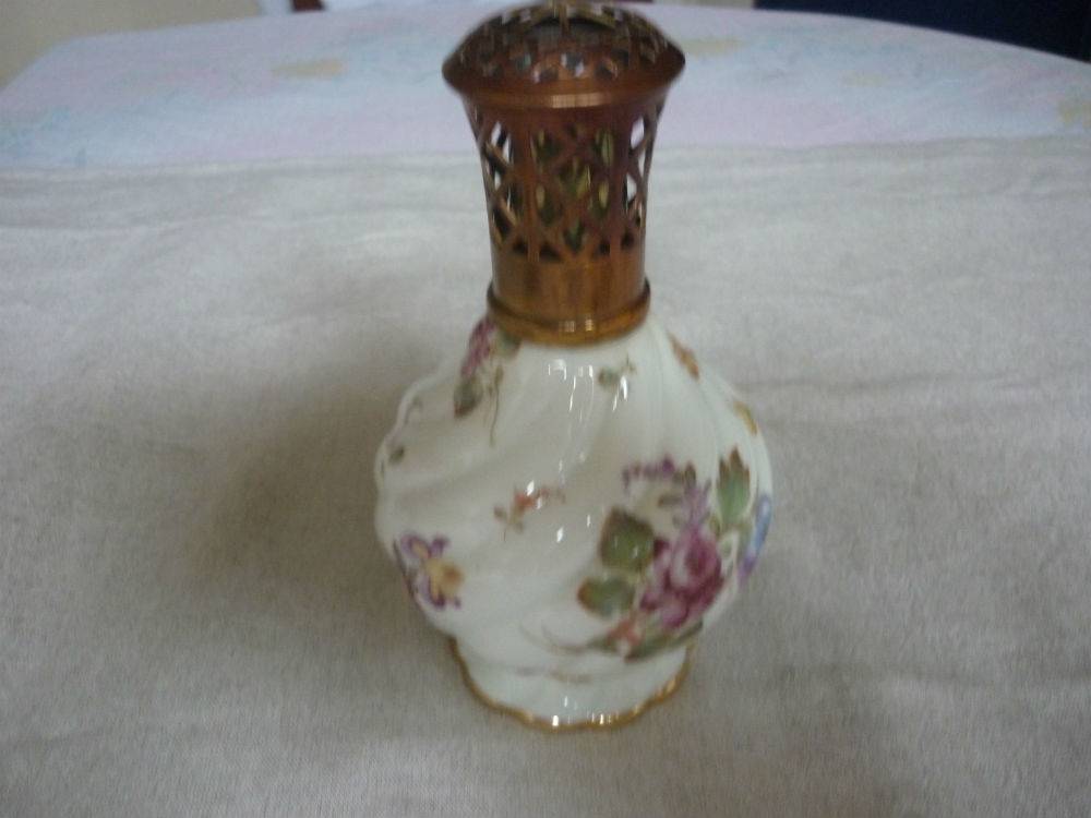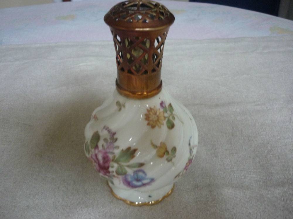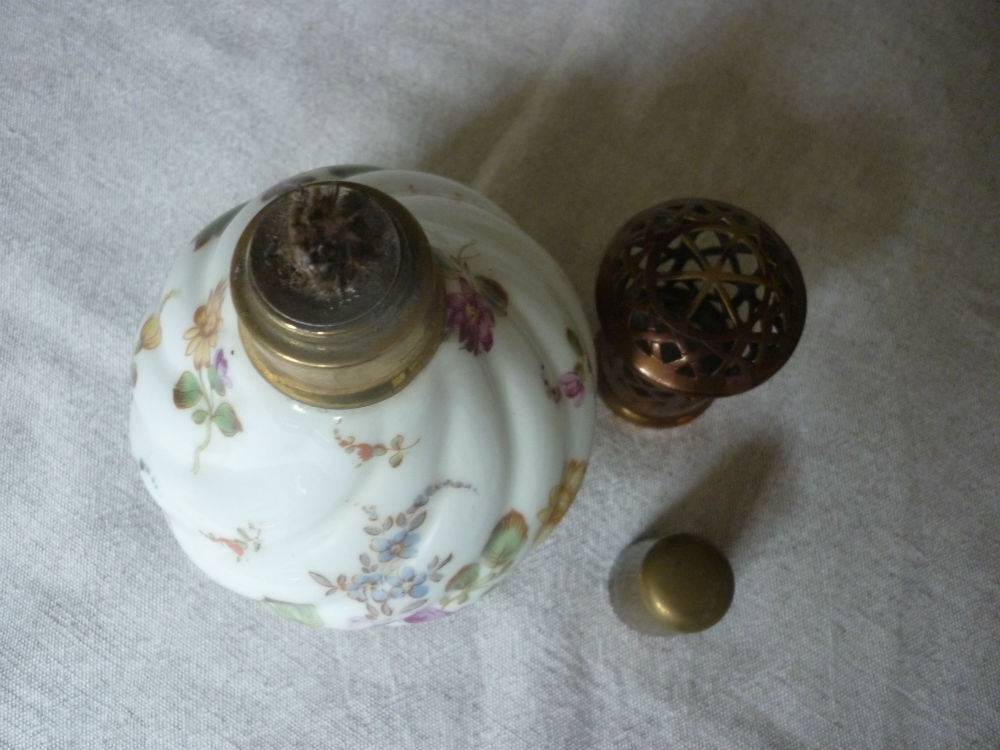 Lampe Berger en porcelaine de Paris a decor de bouquets de fleurs tout autour,corps et piedouche torsadé:a noter qu’il manque la petite pierre faisant office de bruleur,sinon bon etat