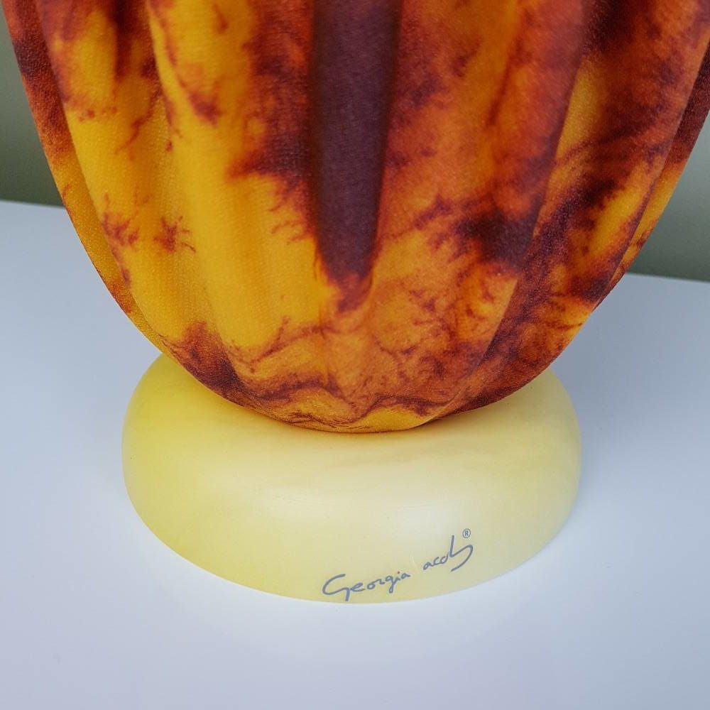 Encore un modèle classique des années 70 dans une version originale et peu vue.Abat jour drapé aux motifs psychédéliques. Socle en marbre. Signature « Georgia Jacob » au pied. Très bon état.