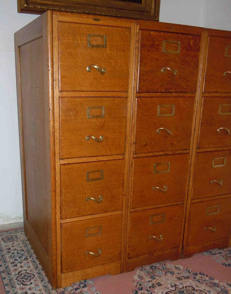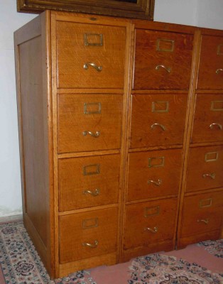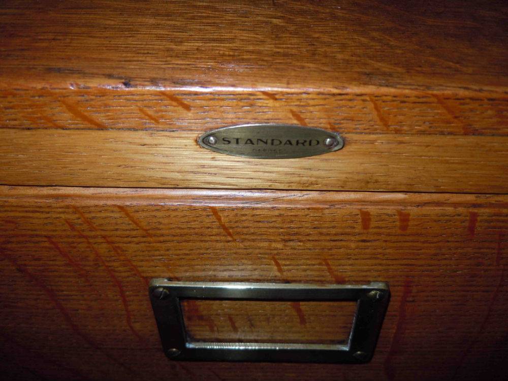 Ce meuble faisait partie d’une importante fabrique de meuble de bureau à l’époque appelée »Standard ».D’ailleurs chaque classeur casier porte une estampille: celui de gauche, en haut, porte la marque « Standard » « marque déposée »; le casier central marque une estampille circulaire avec la marque  » Standard, breveté, et une adresse à Paris ainsi que des initiales »; le classeur de droite porte l’estampille »Meubles de bureau Standard Lille Bordeaux Paris ».