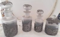 3 flacons verre opale et etain repoussé 16cm, 19cm, 20cm