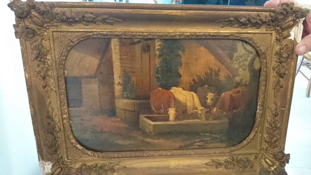 Jolie peinture sur panneau, sans signature, représentant des vaches buvant dans un abreuvoir. La peinture est en bon état.