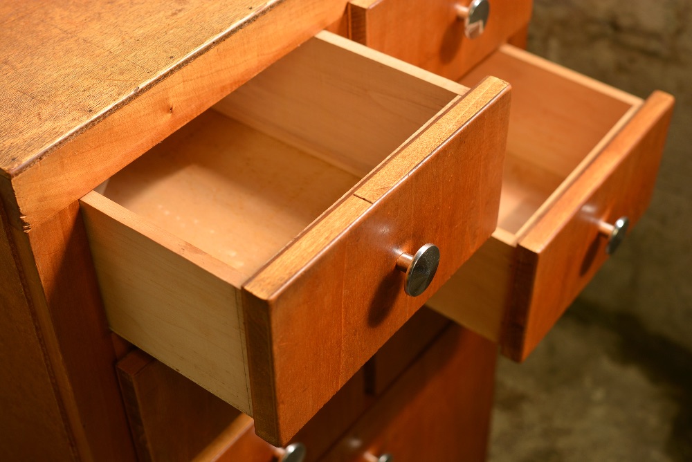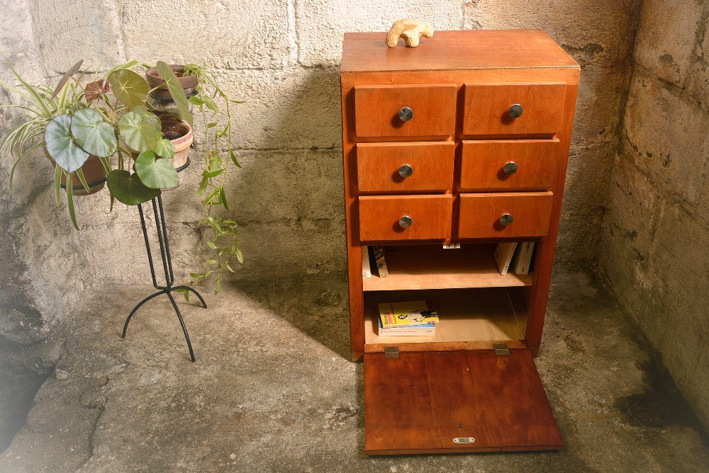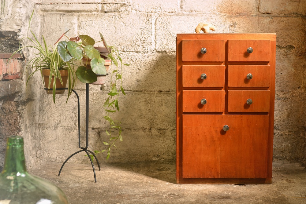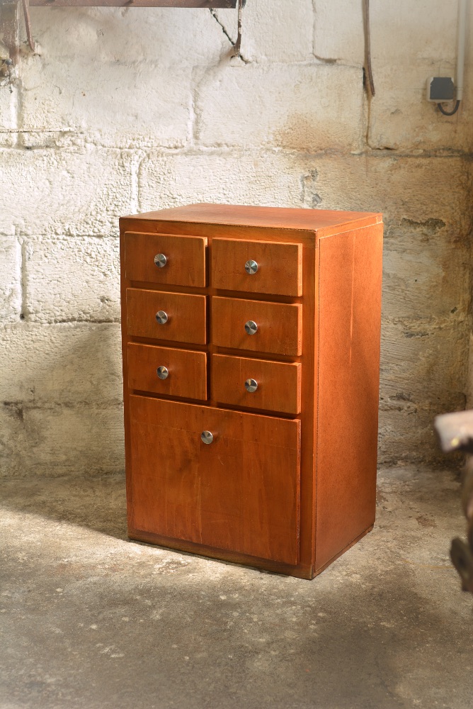 Joli petit meuble de rangement vintage en bois (contreplaqué) ayant appartenu à un grainetier. 6 tiroirs et un placard, avec étagère, ouvrant par le haut. Ses petites dimensions le font loger partout. Profondeur : 50 cm.
