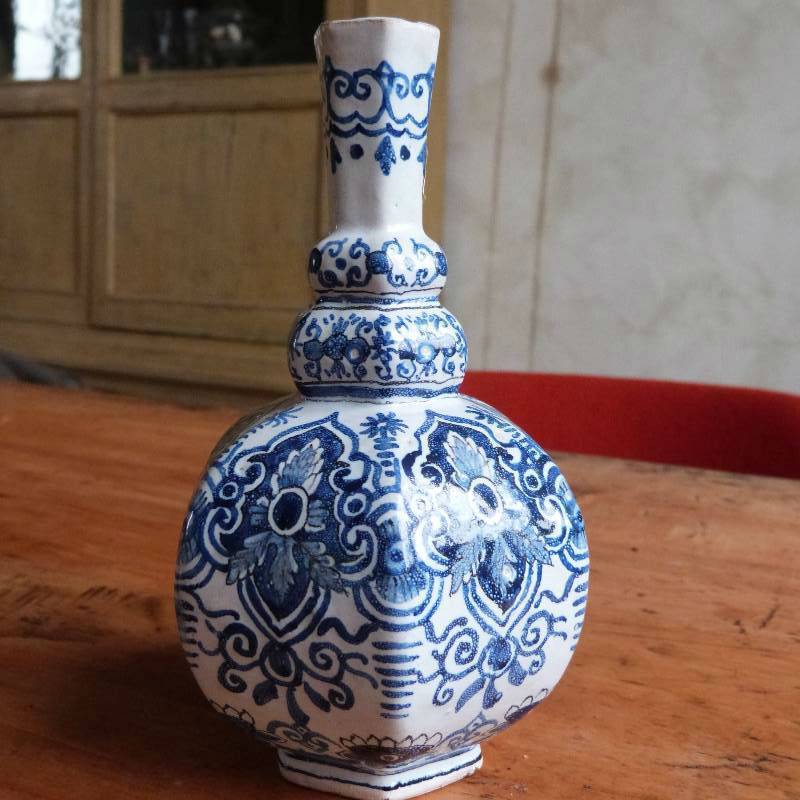 Petit vase en faïence de Delf à décor fait main blanc et bleu, 6 faces, signé APK pour Pieter Adriaen’z Kocks (1701-1703), donc début XVIIIème siècle.