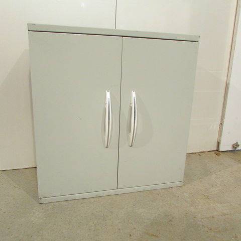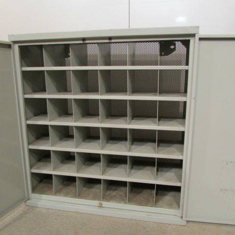 Meuble industriel à casiers ( au nombre de 36 ), de couleur gris clair, poignées blanches.