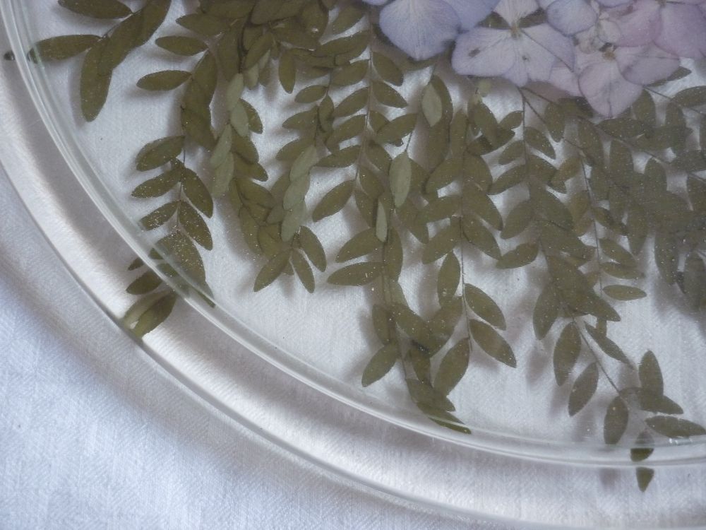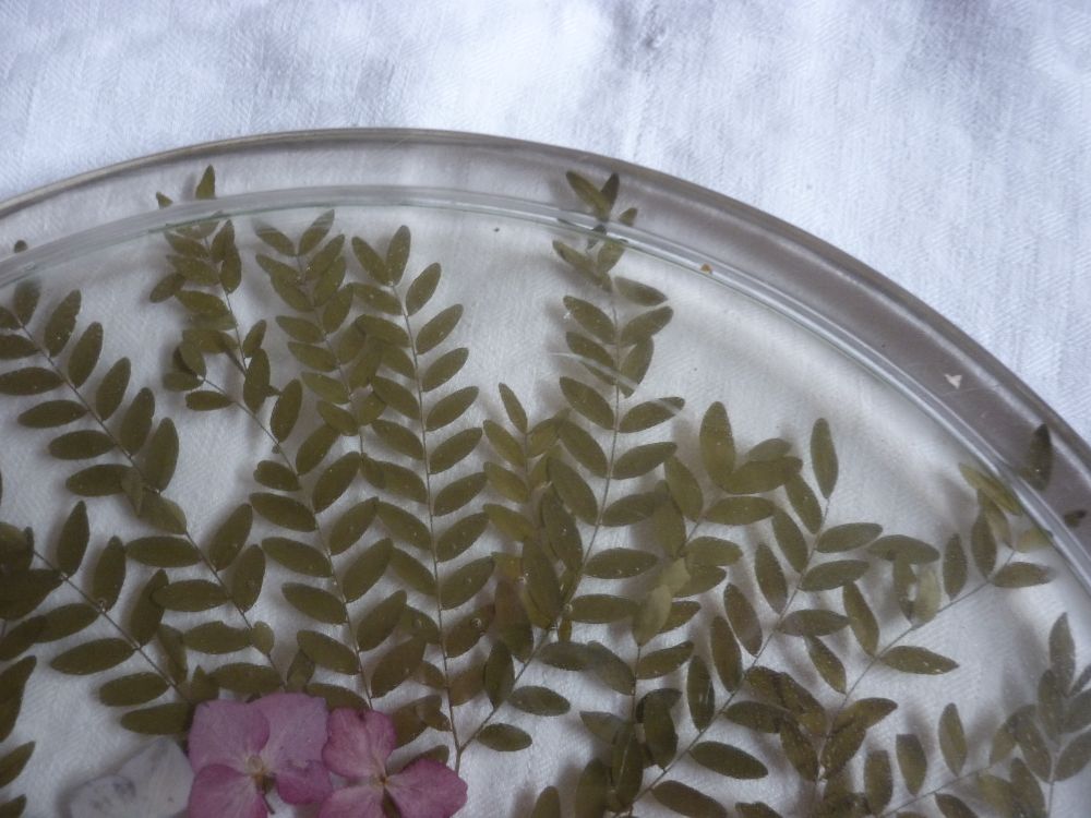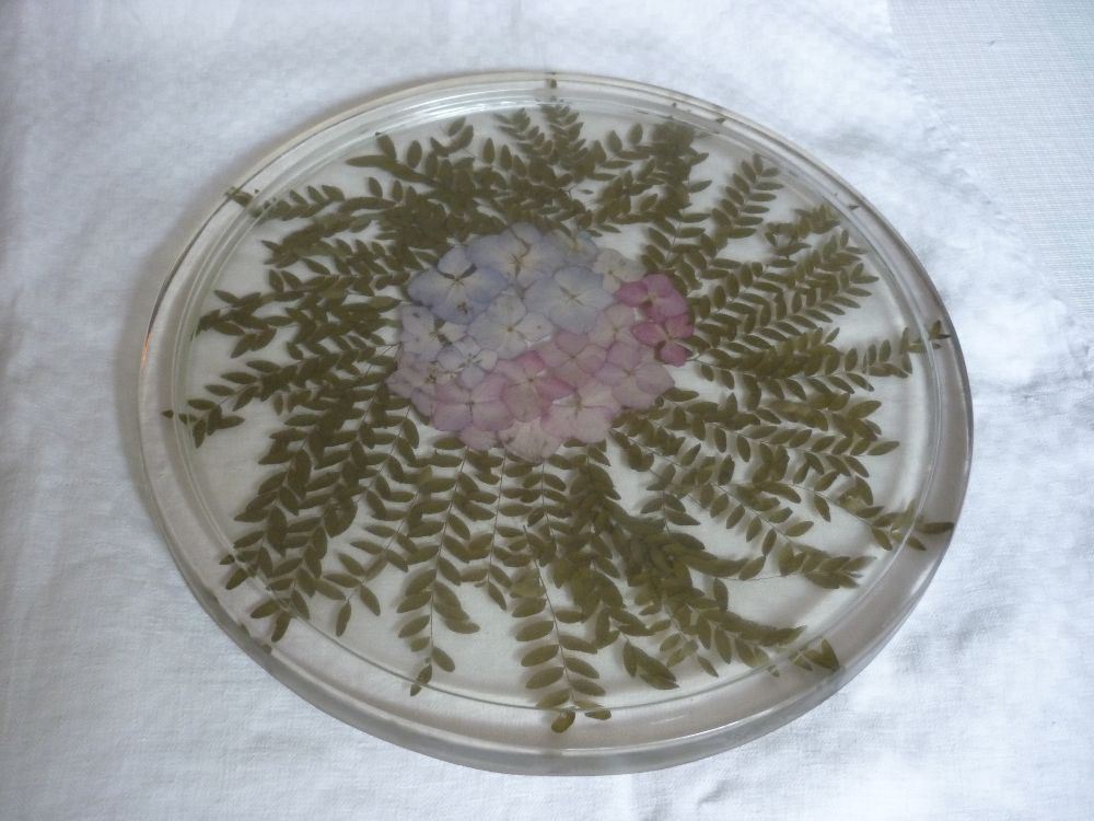 Plateau vintage en verre et plexiglas,diametre 33,5cms,hauteur 2,5cms avec feuilles et fleurs sechees:bon etat