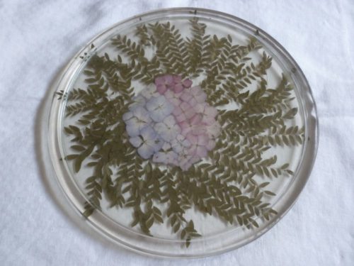 Plateau rond vintage verre et plexiglas fleurs séchées
