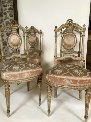 Plusieurs accidents (écartement du bois) mineurs, un léger manque au dessus du dossier sur l’une des chaises, manque partie de la couronne sur le dessus d’un dossier.