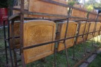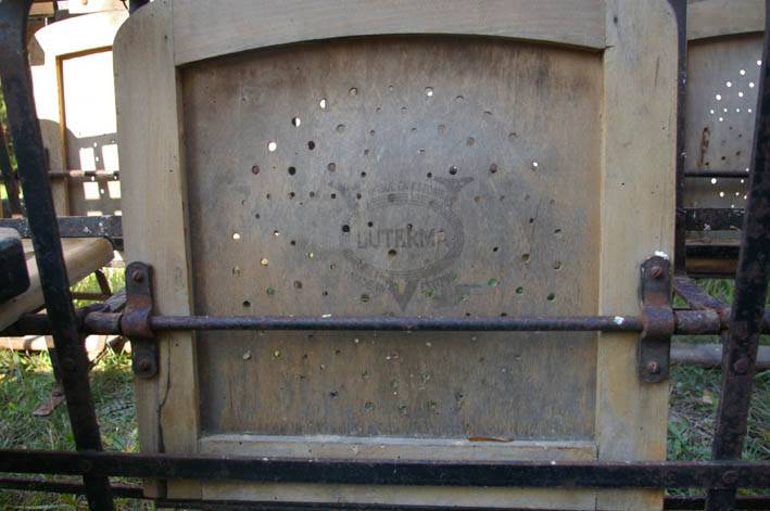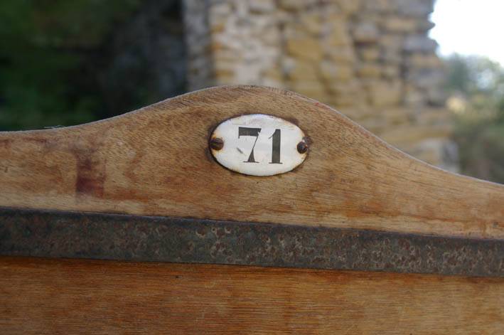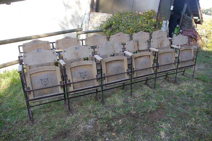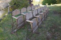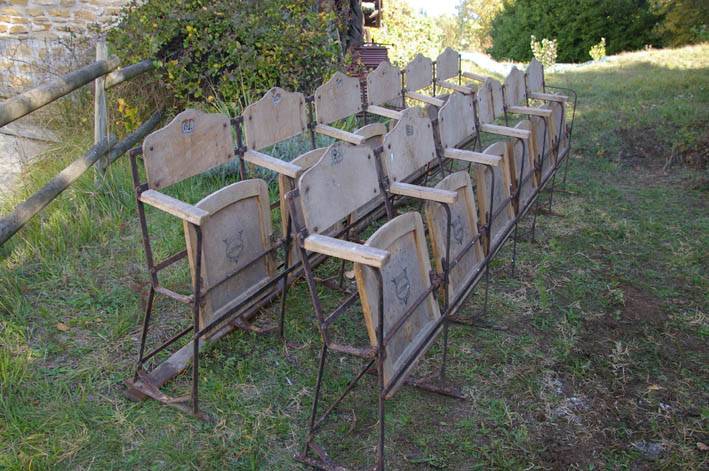 Rangée de six strapontins de la marque Luterma années 20/30. Longueur : 3 mètres. Chaque dossier possède un numéro en céramique. Vendus dans leur jus. Ils seront magnifiques après restauration !