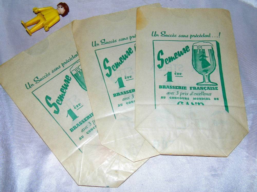 Lot de 3 sachets publicitaires épicerie de la marque BRASSERIE SEMEUSE à HELLEMMES ( nord ) années 70 – Inscriptions sur les 2 faces en vert sur papier cristal – Jamais utilisé – Format : 23 x 14,5 cm