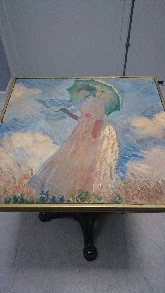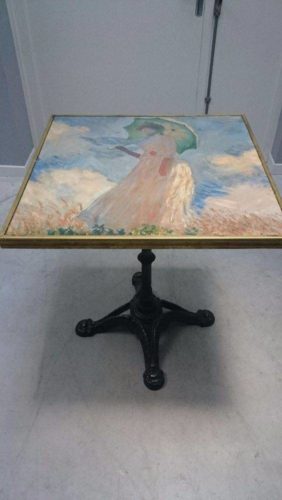 Vends très belle table de bistrot avec piètement en fonte noir et plateau avec décor de lithographie cerclé de laiton. Très beau modèle.