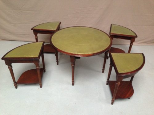 Les tables gigognes ont le dessus en cuir vert décoré d’une vignette dorée et d’un verre de protection.