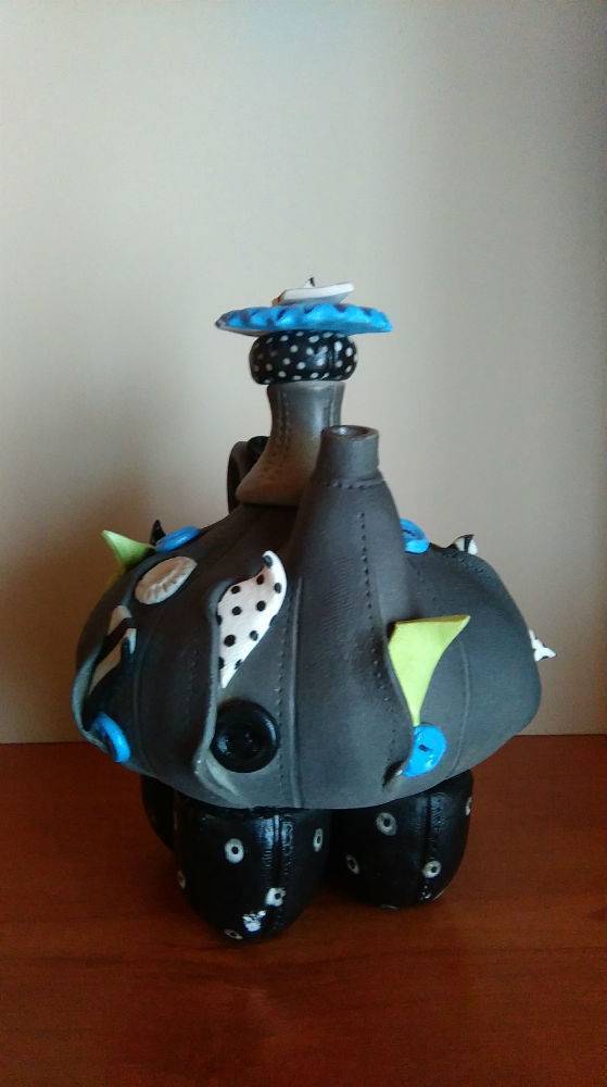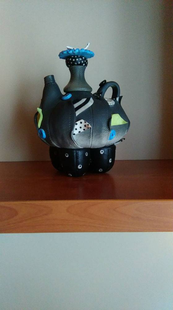 En porcelaine et en pâte polymère, corps de la théière à décor de morceaux de tissus et de boutons très colorés