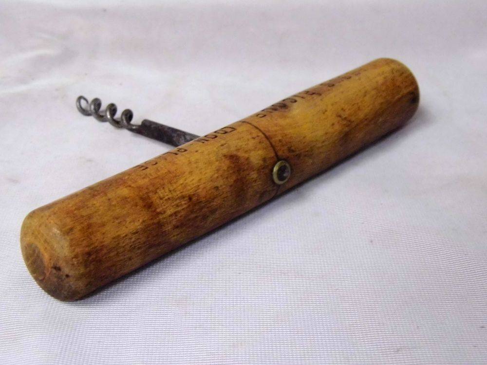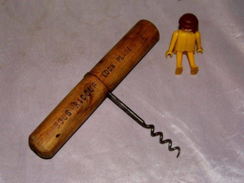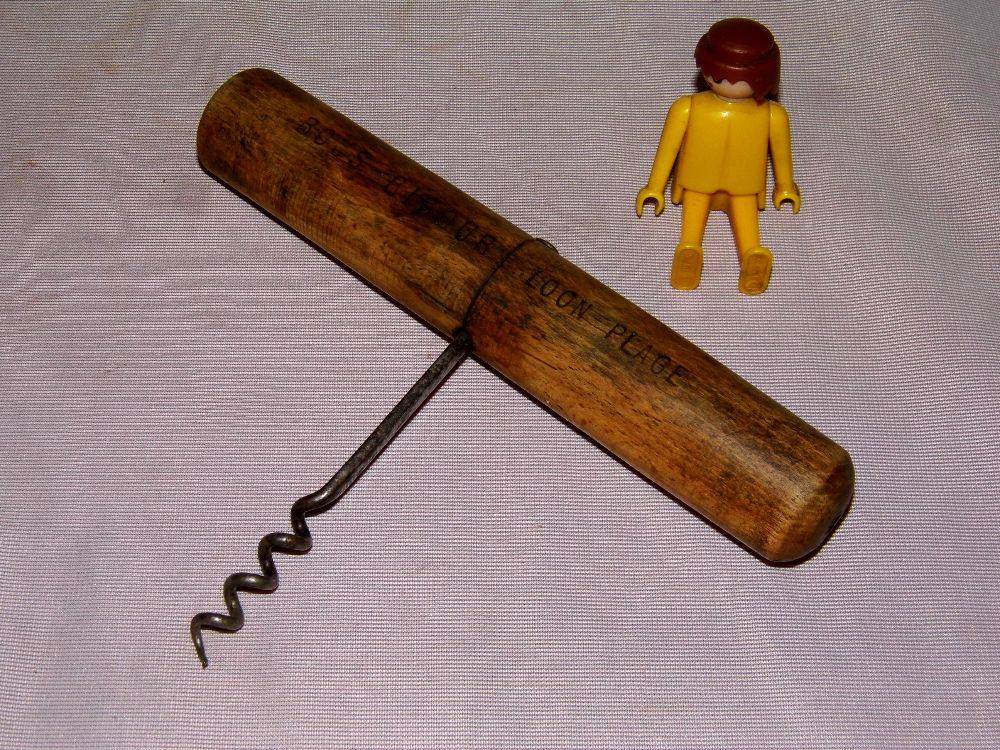 Très grand tire-bouchon en bois des années 60 – Inscriptions gravées en creux des 2 cotés » BOUS RICOUR LOON-PLAGE ( nord ) » – Partie métallique en très bon état avec gravage du fabricant