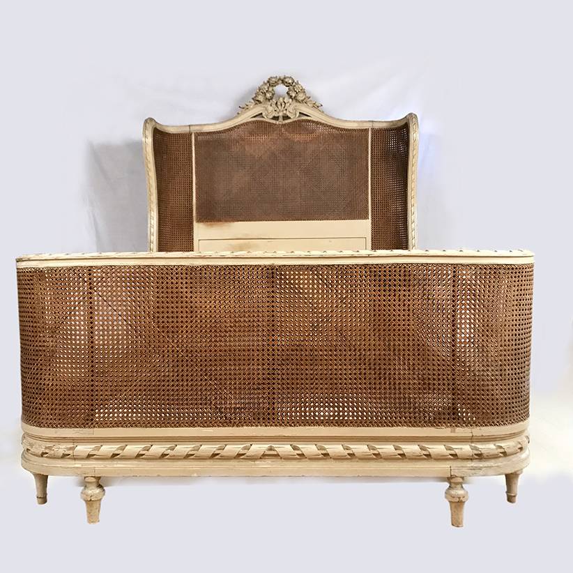 Complet et en bon état. Pas de trou dans le cannage mais celui-ci est à reprendre sur le bord (pied de lit).