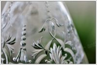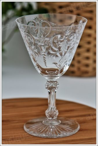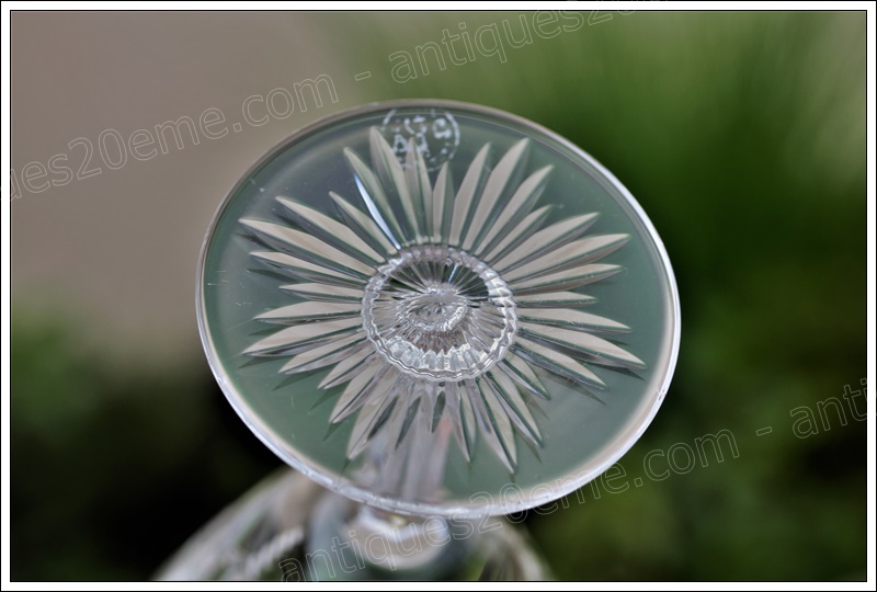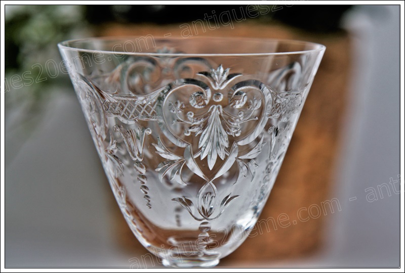 Ce service est l’un des plus rares et des plus délicats services de la cristallerie Baccarat. Véritable oeuvre d’art réalisée uniquement par les Meilleurs Ouvriers de France. Calice évasé en forme de V, gravure typique Louis XV réalisée à la petite roue en cuivre. Jambe soufflée à la bouche avec un vide d’air à l’intérieur et taillée 6 pans avec 2 boutons taillés en diamant à chaque extrémité. Pied rond étoile en jeux d’orgue.