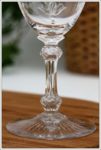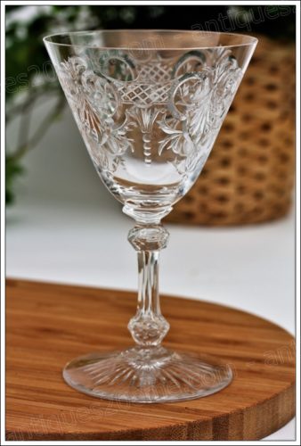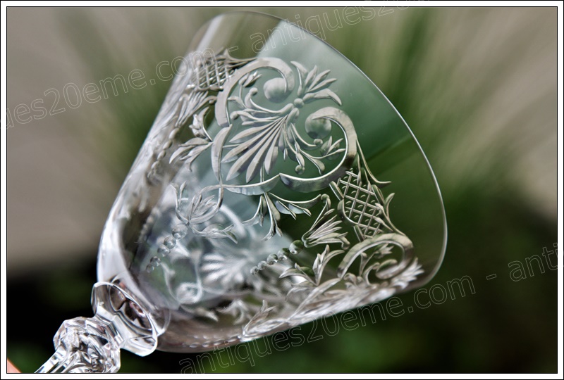 Ce service est l’un des plus rares et des plus délicats services de la cristallerie Baccarat. Véritable oeuvre d’art réalisée uniquement par les Meilleurs Ouvriers de France. Calice évasé en forme de V, gravure typique Louis XV réalisée à la petite roue en cuivre. Jambe soufflée à la bouche avec un vide d’air à l’intérieur et taillée 6 pans avec 2 boutons taillés en diamant à chaque extrémité. Pied rond étoile en jeux d’orgue.