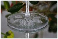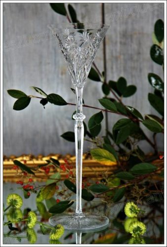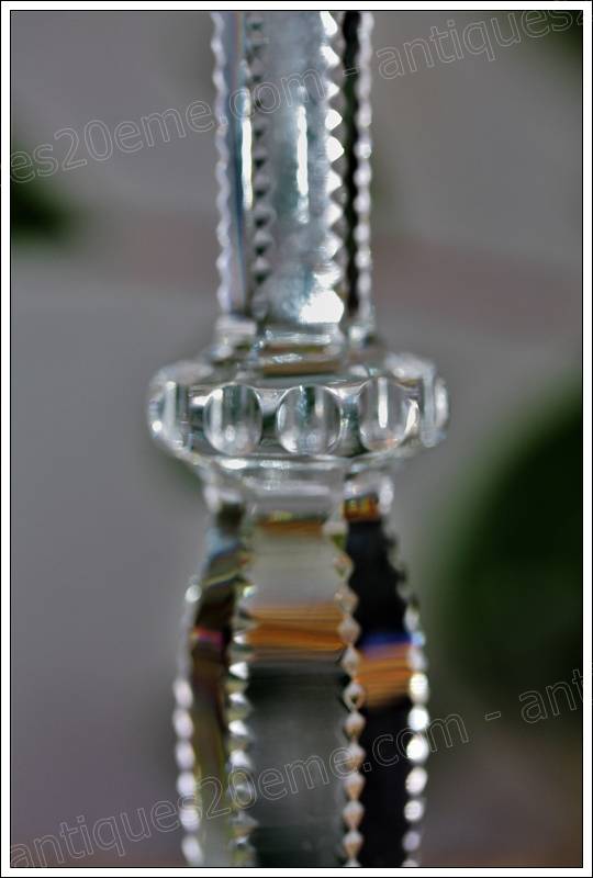 Jambe balustre très haute, taillée de 6 côtes plates et arêtes en dents de scie. Bouton au 2/3 de la jambe taillé. Pied circulaire à décor taillé en étoile et palmettes en forme de fleur.