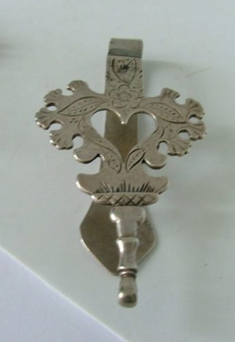 Largest of the 3 with a cut out heart design. Owner’s initials M.B. Maker’s mark E? unknown