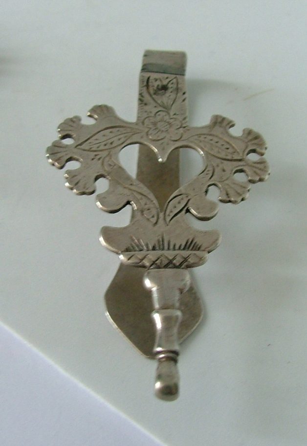 Largest of the 3 with a cut out heart design. Owner’s initials M.B. Maker’s mark E? unknown