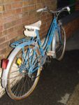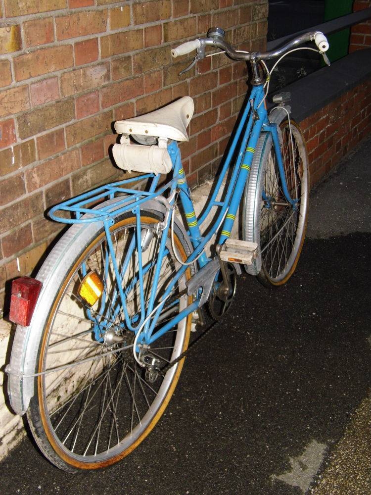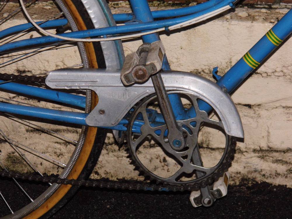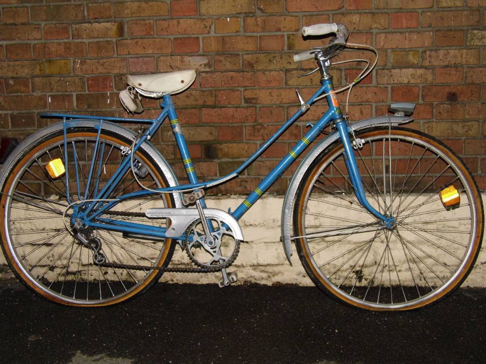 Ancien vélo femme couleur bleu ( Vintage ) – 3 vitesses – Selle bon état – Gardes boues martelés – Freins avant et arrière et dynamo – Feux avant et arriere – Porte bagage arrière – sonnette – Bons pneus – Béquille – trousse sacoche de réparation – Ce vélo est dans son jus